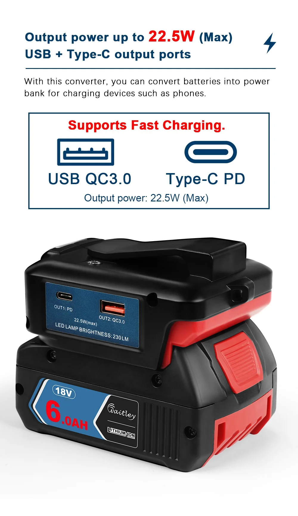 2.Com interface de saída USB e interface de saída tipo C, potência de saída de até 22,5 W (máx.), suporta carregamento rápido QC3.0 e PD.