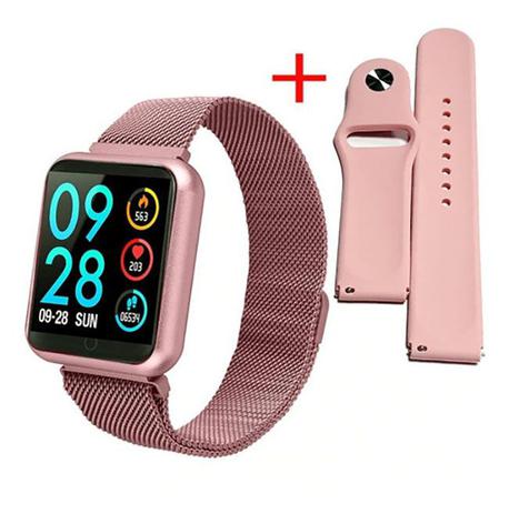 Relógio Smart Watch P80 Rosa C/ Duas Pulseiras Batimento CardíacoAplicativo Mobile: DAFIT OU Happy Sports – Fundo personalizavel com foto via Aplicativo – Leitura na tela de mensagens das redes sociais Controle sua saúde durante o dia a dia com o Smartwatch você informa todos os seus dados sobre esportes, e consegue ajustar todos os seus programas de exercícios e tem um controle de vida mais saudável. O relógio ainda não deixa você perder notificações de chamada e mensagens importantes enquanto pratica seus exercícios. Pulseira com Designer moderno, sendo uma em silicone e outra em metal. As Pulseiras são com fecho magnético ergonômico ajustável (milanese) e pulseira de silicone, serve para todos os pulsos. Principais características: – Tela colorida de 1,3 polegadas – Fonte grande, alto brilho, melhor para olhar. – Monitor de ritmo cardíaco dinâmico durante todo o dia – Sensor de frequência cardíaca incorporado, pode gravar a curva dinâmica da frequência cardíaca em todo o processo de movimento. Suporte ao usuário para verificar todos os tipos de dados do esporte – Múltiplos Modos Esportivos Fornece vários modos de esportes, como caminhada, corrida, escalada, ciclismo, basquete, futebol, badminton, etc. – Monitor de sono Ele pode gravar automaticamente o seu sono, você também pode ver a duração do sono e mais dados no aplicativo, ajudando você a desenvolver bons hábitos de sono – Longa duração da bateria Carregamento de absorção magnética, carregamento simples, baixo consumo de energia. A bateria interna de iões de lítio de 200mAh garante 15 dias em standby quando totalmente carregada – Interface APP Todos os recursos são refletidos no aplicativo, operam facilmente, analisam dados ao mesmo tempo, dão melhores instruções Informações Gerais Técnicas: Modelo: P80 Versão de Bluetooth: Bluetooth 4.0 Sistemas Operacionais Compatíveis: – Bluetooh 4.0; -A prova de Respingos D’água – Língua: Portugues e outras Modo Operacional: Botão de toque Bateria: – Até 7 dias de Uso Comum (Em stand by pode durar até 25 dias) *essas informações podem variar conforme o uso do seu T80. -Battery Capacity: 200mAh