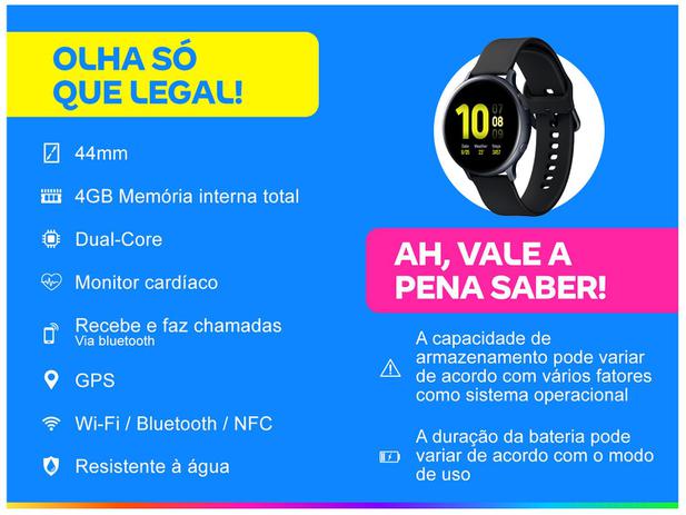 Se você pensa que o smartwatch é apenas um acessório que marca as horas, precisa conhecer Samsung Galaxy Watch Active2. Com um design moderno e minimalista, ele vem equipado com funções que facilitarão o seu dia a dia, principalmente para quem deseja levar um estilo de vida saudável. Tenha informações precisas sobre a sua saúde, como batimentos cardíacos até monitoramento de treinos. Basta apenas colocá-lo no pulso e se exercitar para que ele comece a fazer as marcações. Além disso, ele permite que você acompanhe também sua saúde mental, usando o monitor de estresse para verificar quando estiver se sentindo tenso, sugerindo exercícios de respiração guiada para promover relaxamento. Disponível na cor preta, sua pulseira de silicone traz um visual sofisticado e sua caixa de 44mm vem com um display de 1,4″ com telas e bordas finas, oferecendo maior visualização de conteúdo. Sua memória de 4GB permite que você tenha espaço para baixar seus aplicativos favoritos, enquanto você se mantém conectado através da rede 4G LTE, levando seus contatos, mensagens e músicas sem a necessidade de ter seu celular por perto. E se você acha que isso é pouco, ele ainda permite que você faça combinações de roupas com o visor do relógio. Ao tirar uma foto do seu look do dia, o seu smartwatch escolherá um mostrador de relógio para combinar com o seu visual e o seu humor, deixando ele com a sua cara.
